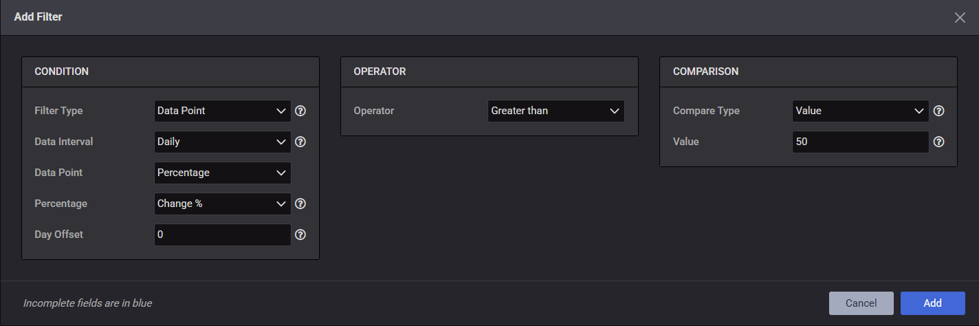 To return volume data for all securities that closed higher than 50%, create a filter with the following selections. Then create a column with the following selections. Click image to zoom in